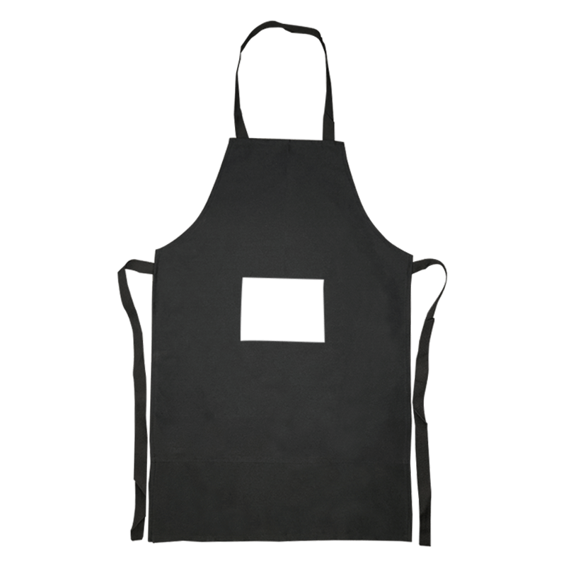 Durable large black polyester apron with white pocket for high quality, full colour printing. Perfect for personalised gifts and corporate branding.